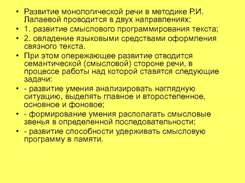 Слайд 19Развитие монологической речи в методике Р.И. Лалаевой проводится в двух направлениях: