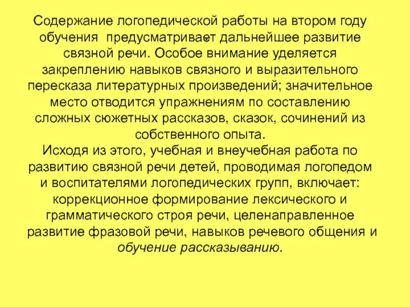 Содержание логопедической работы на втором году обучения предусматривает дальнейшее развитие
