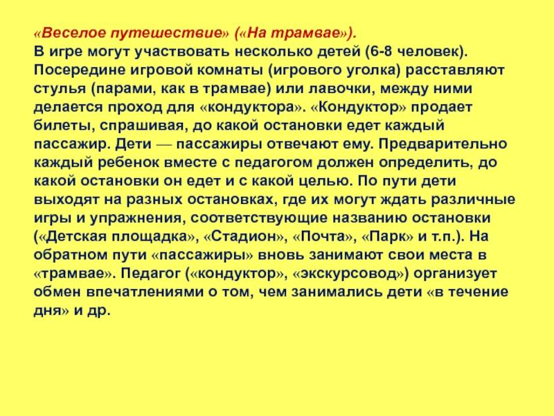 Посередине игровой комнаты (игрового уголка) расставляют стулья (парами, как в трамвае) или лавочки, между ними делается проход для «кондуктора». «Кондуктор» продает билеты, спрашивая, до какой остановки едет каждый пассажир. Дети — пассажиры отвечают ему. Предварительно каждый ребенок вместе с педагогом должен определить, до какой остановки он едет и с какой целью. По пути дети выходят на разных остановках, где их могут ждать различные игры и упражнения, соответствующие названию остановки («Детская площадка», «Стадион», «Почта», «Парк» и т.п.). На обратном пути «пассажиры» вновь занимают свои места в «трамвае». Педагог («кондуктор», «экскурсовод») организует обмен впечатлениями о том, чем занимались дети «в течение дня» и др.