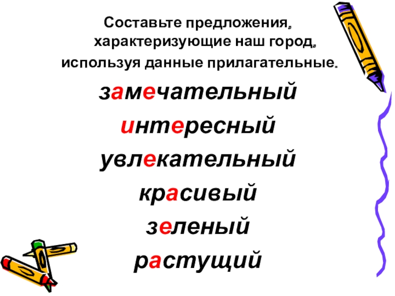 Составьте предложения, характеризующие наш город, используя данные прилагательные.замечательныйинтересныйувлекательныйкрасивыйзеленыйрастущий