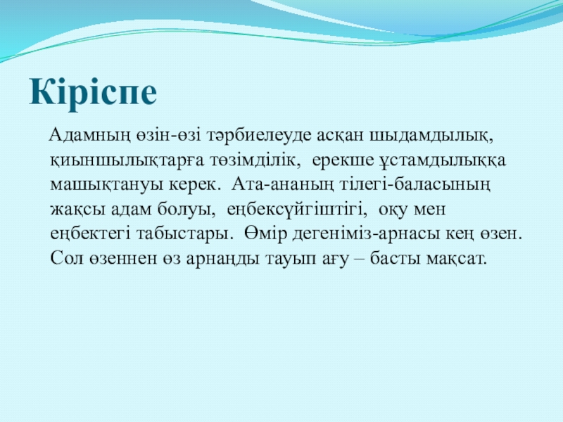машықтануы керек. Ата-ананың тілегі-баласының жақсы адам болуы, еңбексүйгіштігі, оқу мен еңбектегі табыстары. Өмір дегеніміз-арнасы кең өзен. Сол өзеннен өз арнаңды тауып ағу – басты мақсат.
