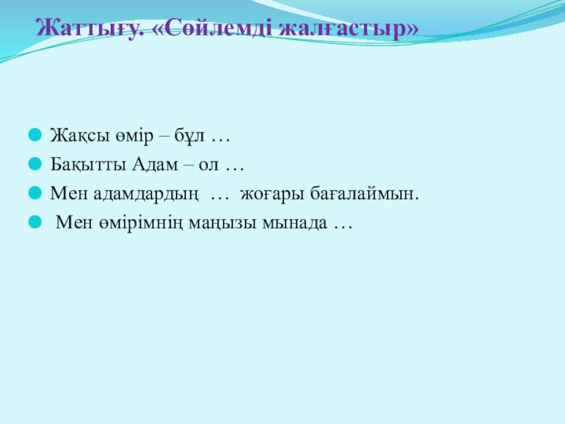 Слайд 7Жаттығу. «Сөйлемді жалғастыр»