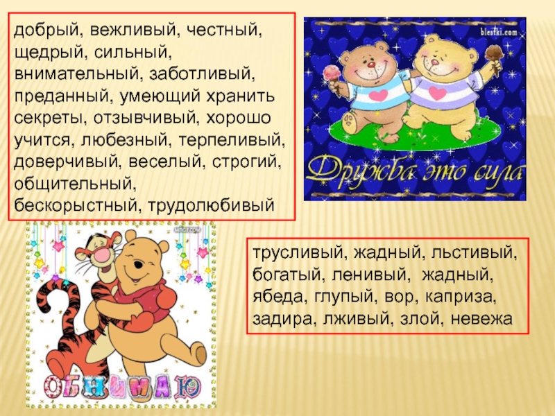 богатый, ленивый, жадный, ябеда, глупый, вор, каприза, задира, лживый, злой, невежа