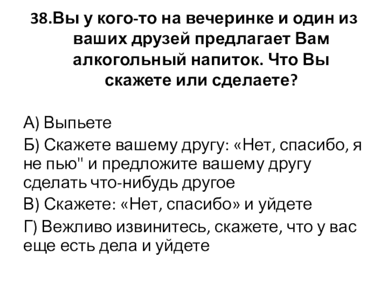 Б) Скажете вашему другу: «Нет, спасибо, я не пью" и предложите вашему другу сделать что-нибудь другое