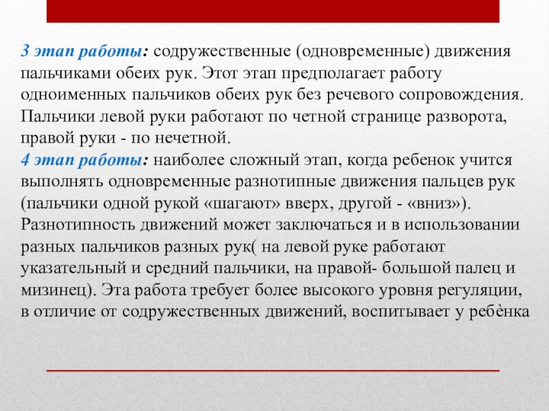 Слайд 103 этап работы: содружественные (одновременные) движения пальчиками обеих рук. Этот этап