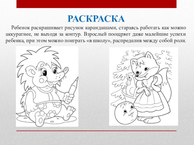 не выходя за контур. Взрослый поощряет даже малейшие успехи ребенка, при этом можно поиграть «в школу», распределив между собой роли.