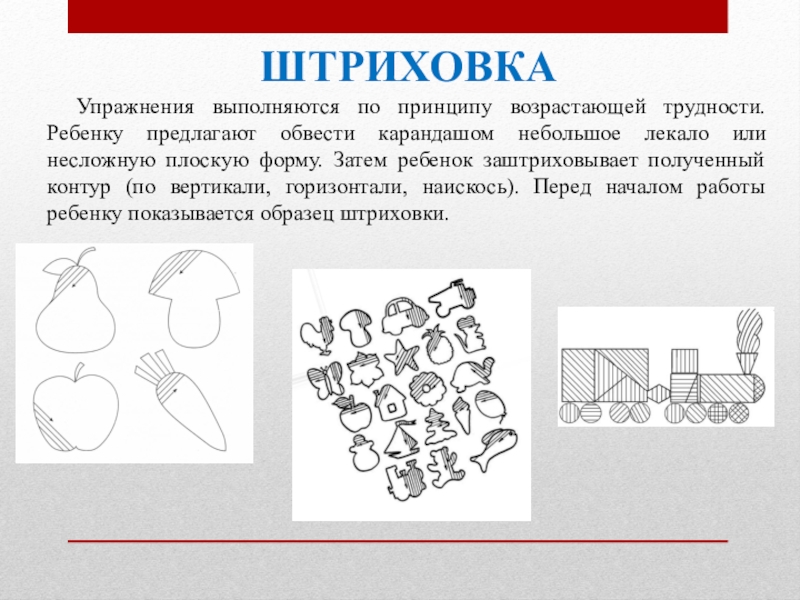 небольшое лекало или несложную плоскую форму. Затем ребенок заштриховывает полученный контур (по вертикали, горизонтали, наискось). Перед началом работы ребенку показывается образец штриховки.
