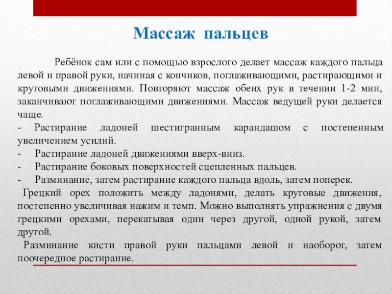 помощью взрослого делает массаж каждого пальца левой и правой руки, начиная с кончиков, поглаживающими, растирающими и круговыми движениями. Повторяют массаж обеих рук в течении 1-2 мин, заканчивают поглаживающими движениями. Массаж ведущей руки делается чаще.