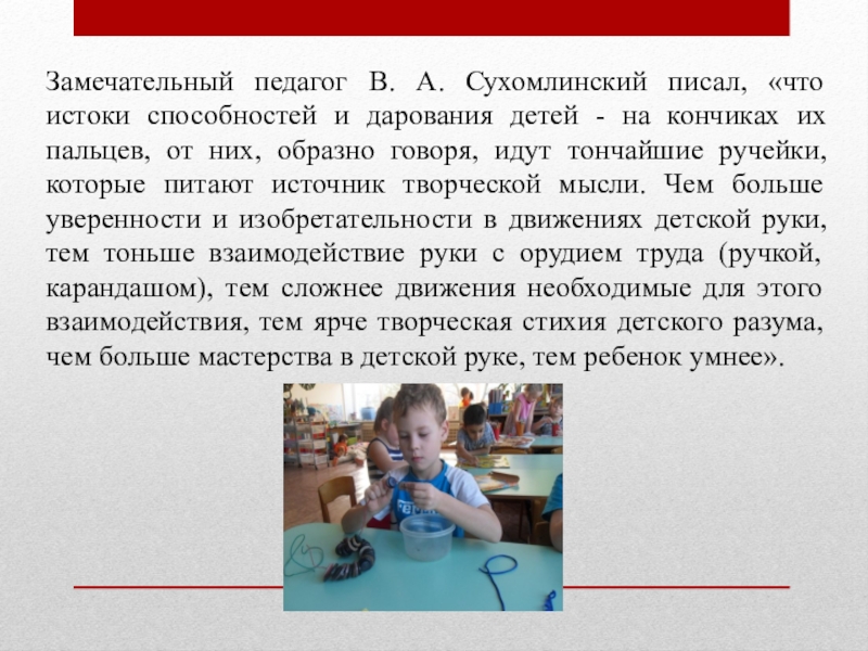 Слайд 2Замечательный педагог В. А. Сухомлинский писал, «что истоки способностей и дарования