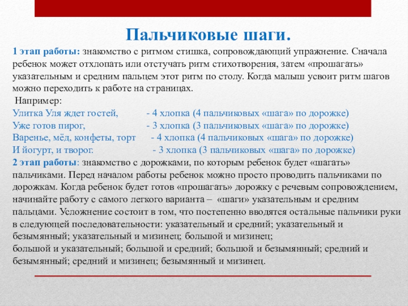 ребенок может отхлопать или отстучать ритм стихотворения, затем «прошагать» указательным и средним пальцем этот ритм по столу. Когда малыш усвоит ритм шагов можно переходить к работе на страницах.