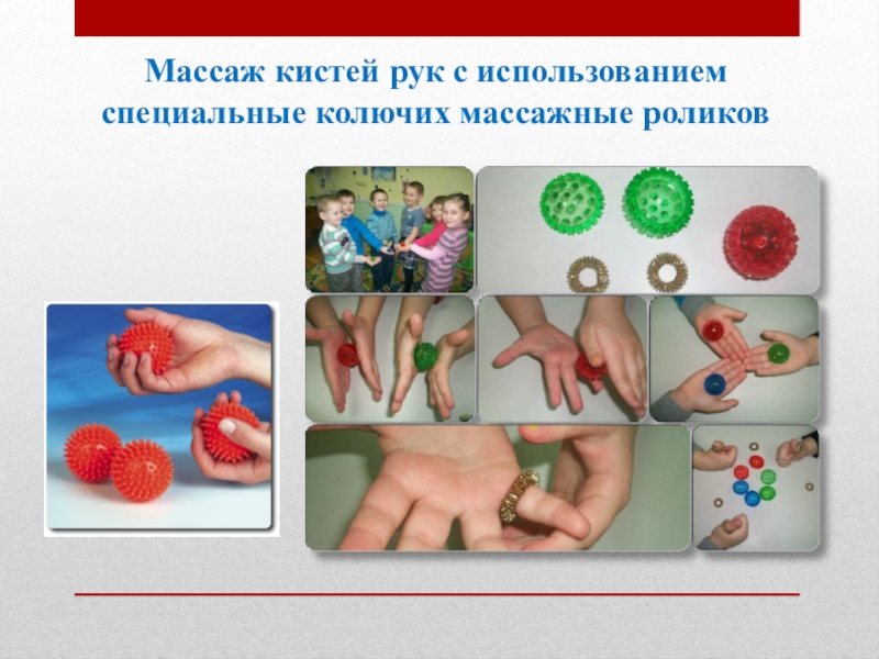 Слайд 4Массаж кистей рук с использованием специальные колючих массажные роликов