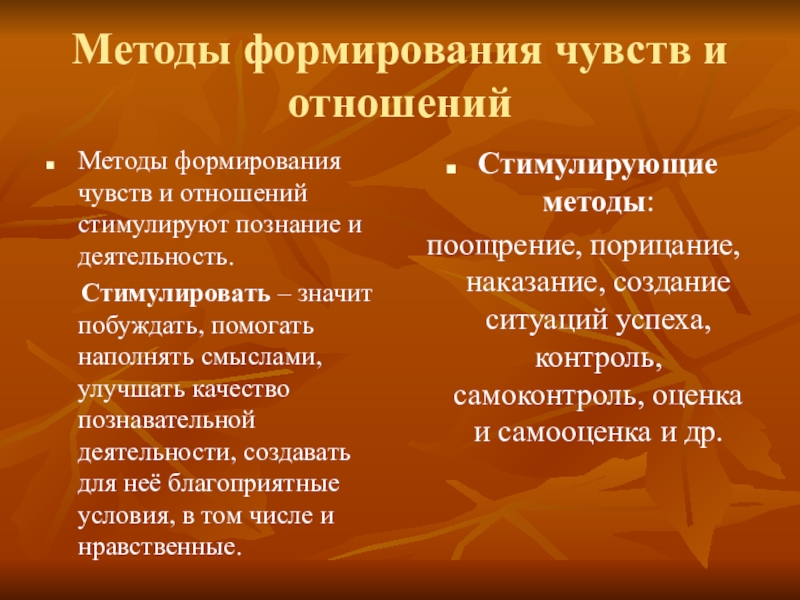 поощрение, порицание, наказание, создание ситуаций успеха, контроль, самоконтроль, оценка и самооценка и др.