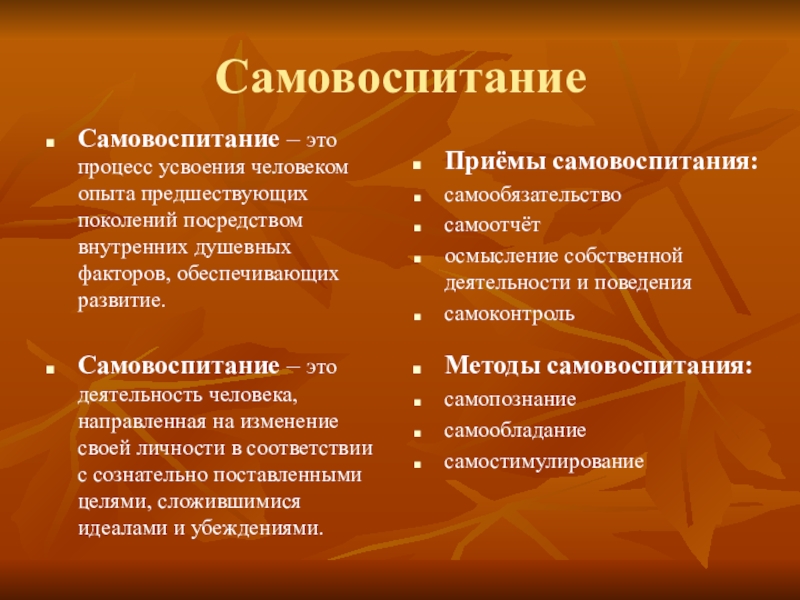 Самовоспитание – это деятельность человека, направленная на изменение своей личности в соответствии с сознательно поставленными целями, сложившимися идеалами и убеждениями.
