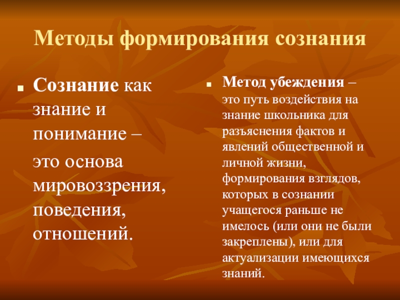 Метод убеждения – это путь воздействия на знание школьника для разъяснения фактов и явлений общественной и личной жизни, формирования взглядов, которых в сознании учащегося раньше не имелось (или они не были закреплены), или для актуализации имеющихся знаний.