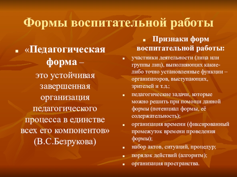 Признаки форм воспитательной работы: