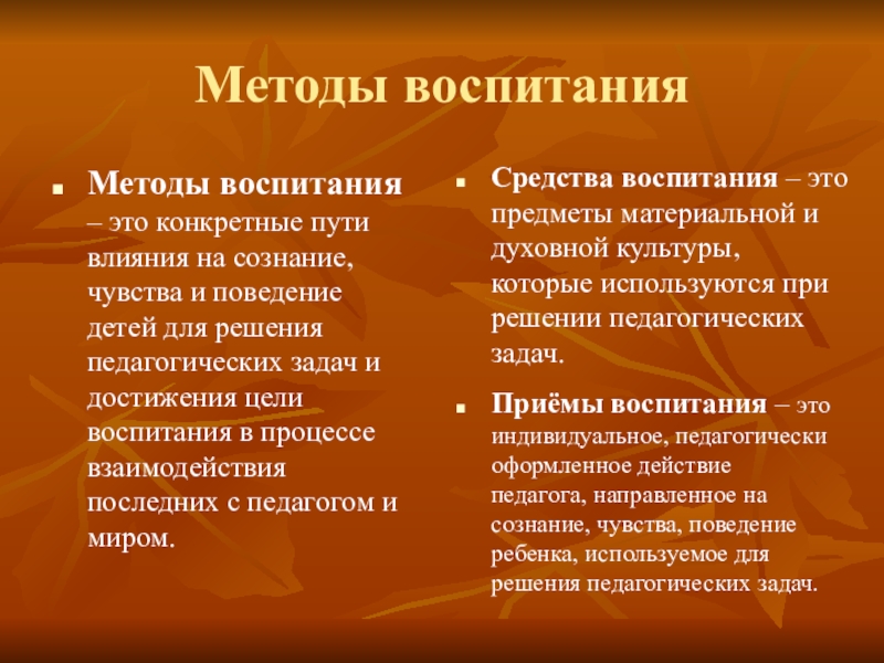Средства воспитания – это предметы материальной и духовной культуры, которые используются при решении педагогических задач.