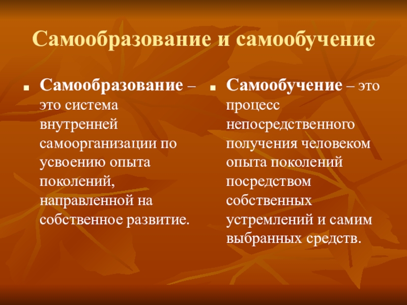 Самообучение – это процесс непосредственного получения человеком опыта поколений посредством собственных устремлений и самим выбранных средств.