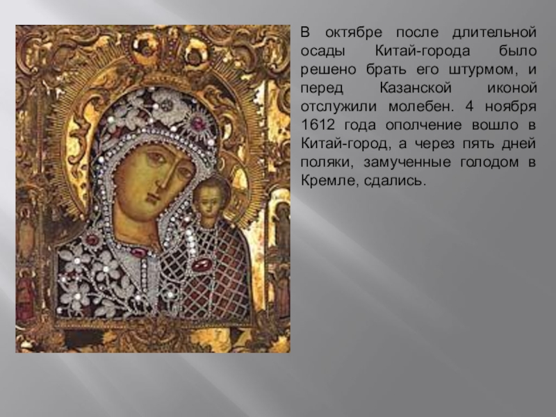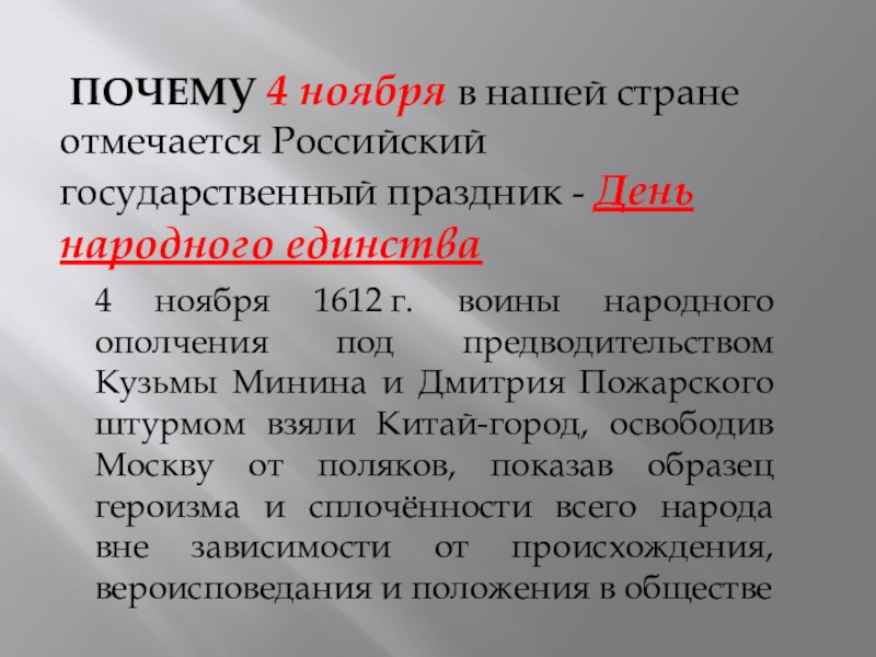 4 ноября 1612 г. воины народного ополчения под предводительством Кузьмы Минина и Дмитрия Пожарского штурмом взяли Китай-город, освободив Москву от поляков, показав образец героизма и сплочённости всего народа вне зависимости от происхождения, вероисповедания и положения в обществе