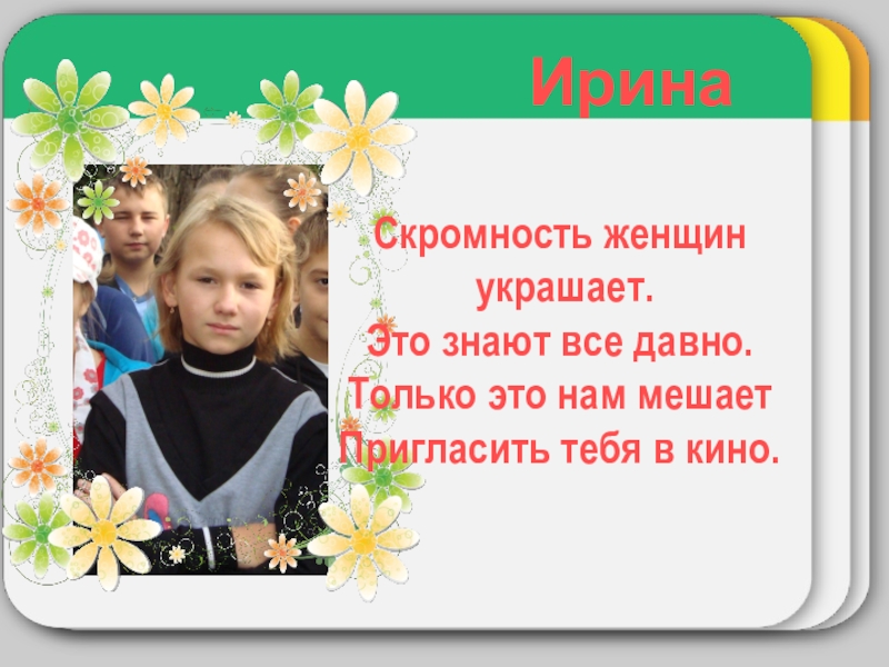 ИринаСкромность женщин  украшает. Это знают все давно.Только это нам мешает Пригласить тебя в кино.