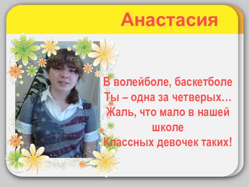 АнастасияВ волейболе, баскетболе Ты – одна за четверых…Жаль, что мало в нашей школе Классных девочек таких!