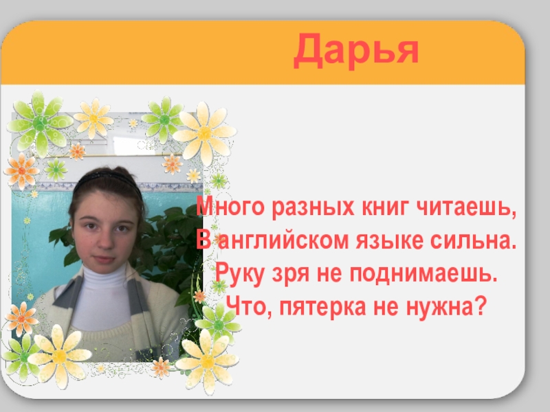 ДарьяМного разных книг читаешь,В английском языке сильна.Руку зря не поднимаешь. Что, пятерка не нужна?