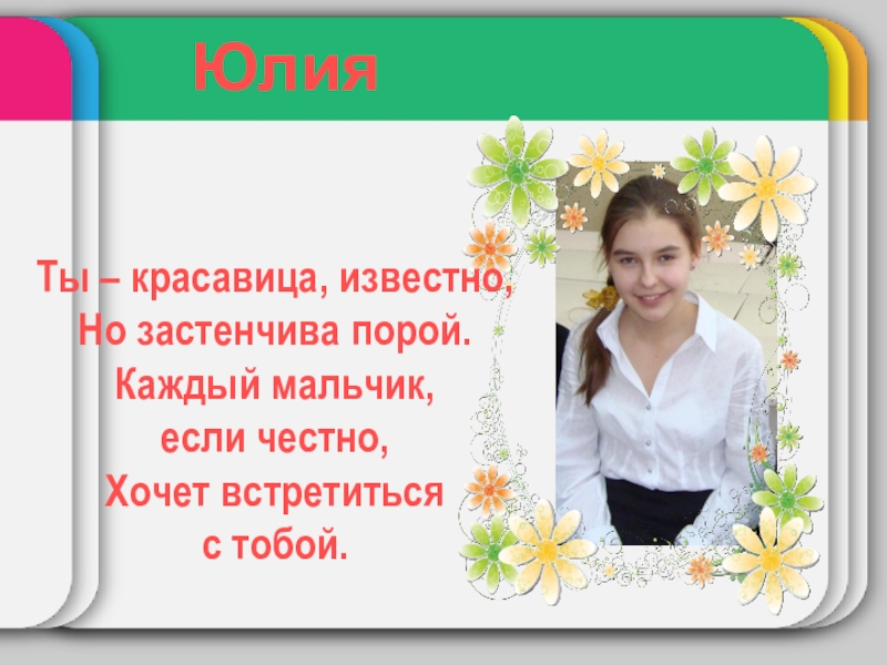 ЮлияТы – красавица, известно,Но застенчива порой.Каждый мальчик, если честно,Хочет встретиться с тобой.