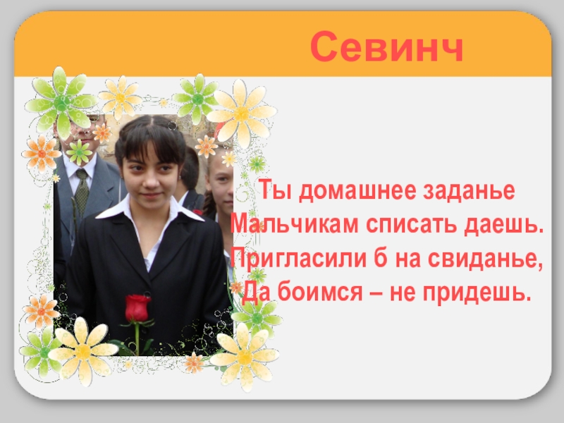 СевинчТы домашнее заданье Мальчикам списать даешь.Пригласили б на свиданье,Да боимся – не придешь.