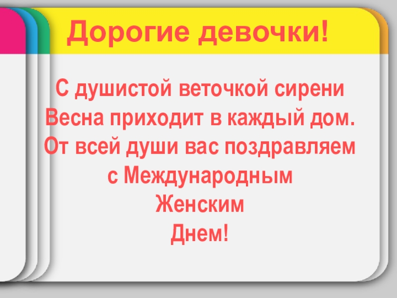 Дорогие девочки!С душистой веточкой сирениВесна приходит в каждый дом.От всей души вас поздравляем с Международным ЖенскимДнем!