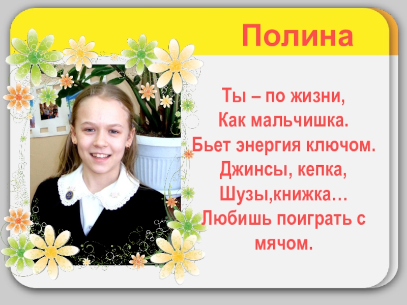 ПолинаТы – по жизни,  Как мальчишка.Бьет энергия ключом.Джинсы, кепка,Шузы,книжка…Любишь поиграть с мячом.