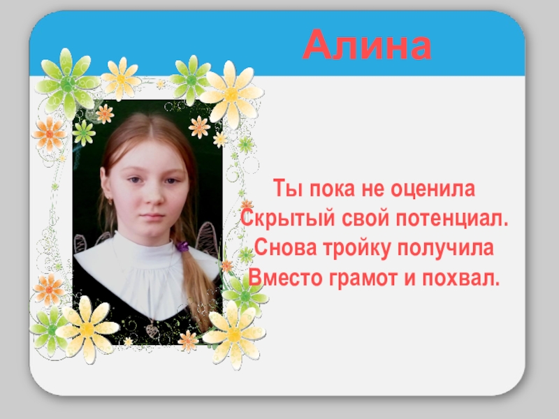 АлинаТы пока не оценила Скрытый свой потенциал.Снова тройку получила Вместо грамот и похвал.