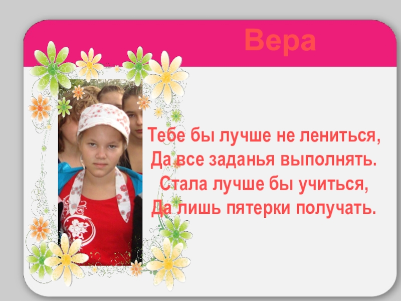 ВераТебе бы лучше не лениться, Да все заданья выполнять.Стала лучше бы учиться,Да лишь пятерки получать.