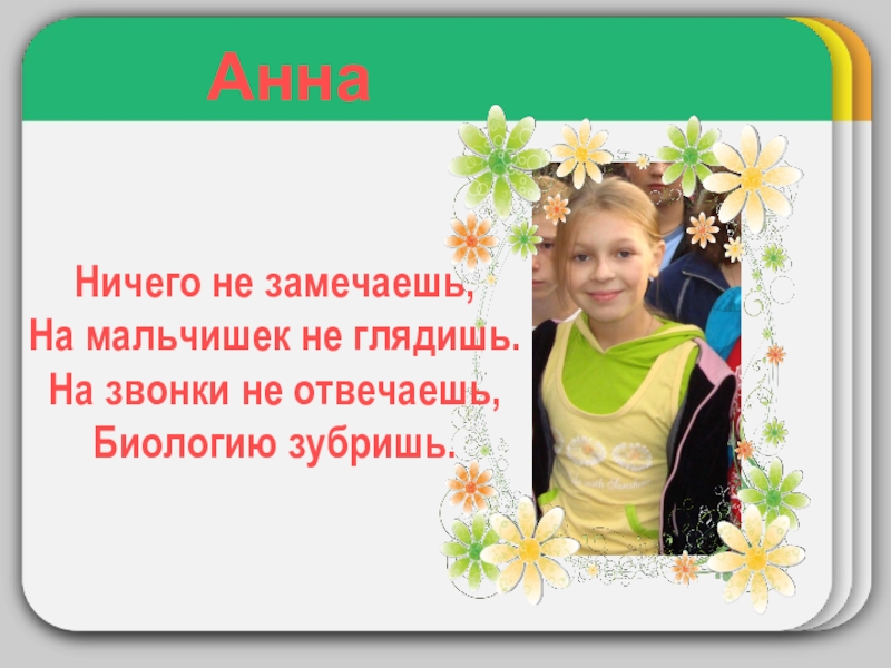 АннаНичего не замечаешь,На мальчишек не глядишь.На звонки не отвечаешь,Биологию зубришь.
