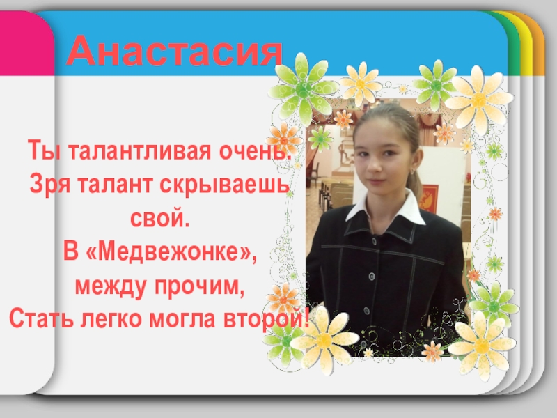 АнастасияТы талантливая очень. Зря талант скрываешь свой.В «Медвежонке», между прочим,Стать легко могла второй!