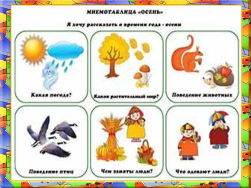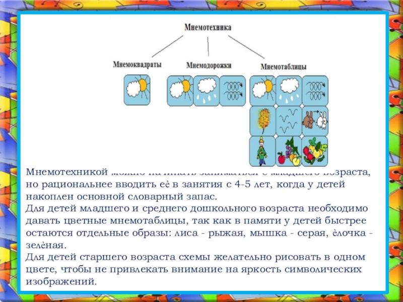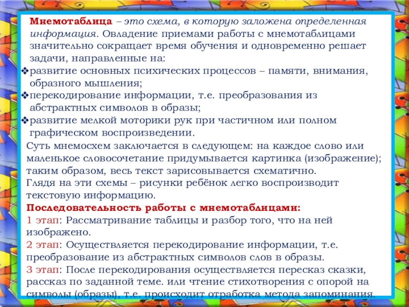 Мнемотаблица – это схема, в которую заложена определенная информация. Овладение приемами работы с мнемотаблицами значительно сокращает время обучения и одновременно решает задачи, направленные на: