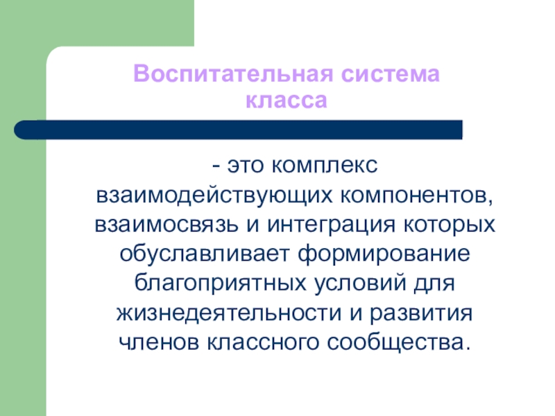 Воспитательная система класса- это комплексвзаимодействующих компонентов,взаимосвязь и интеграция которыхобуславливает формированиеблагоприятных условий дляжизнедеятельности и развитиячленов классного сообщества.