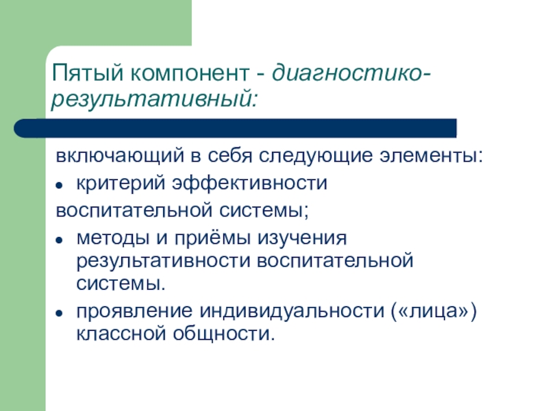 Пятый компонент - диагностико-результативный:включающий в себя следующие элементы:критерий эффективностивоспитательной системы;методы и приёмы изучения результативности воспитательной системы.проявление индивидуальности