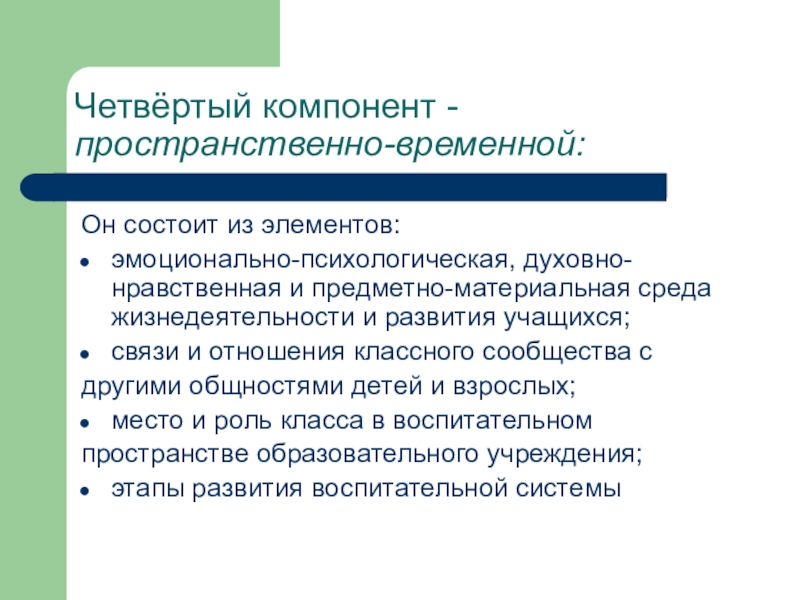 Четвёртый компонент - пространственно-временной:Он состоит из элементов:эмоционально-психологическая, духовно-нравственная и предметно-материальная среда жизнедеятельности и развития учащихся;связи и отношения
