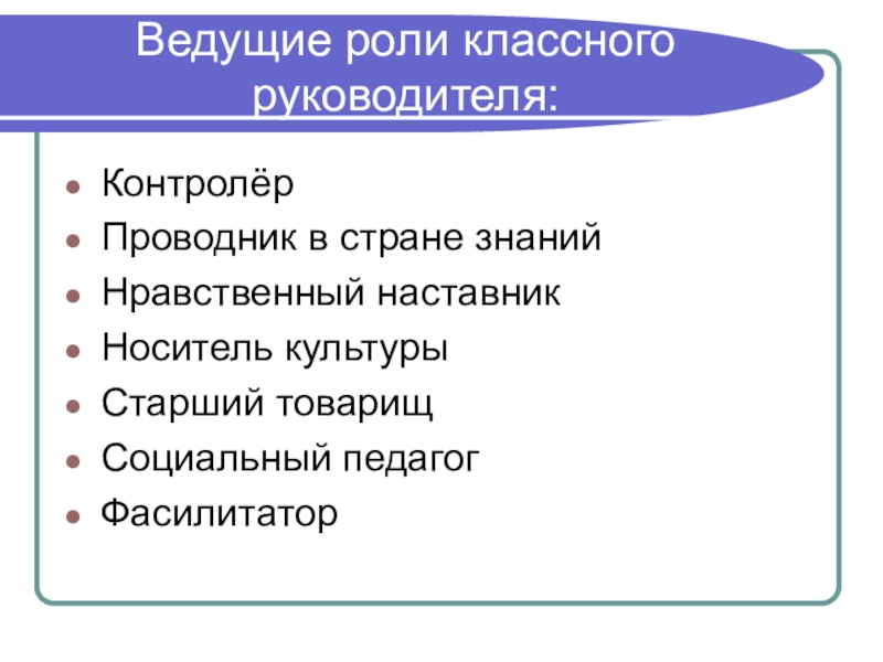 Ведущие роли классного руководителя:КонтролёрПроводник в стране знанийНравственный наставникНоситель культурыСтарший товарищСоциальный педагогФасилитатор