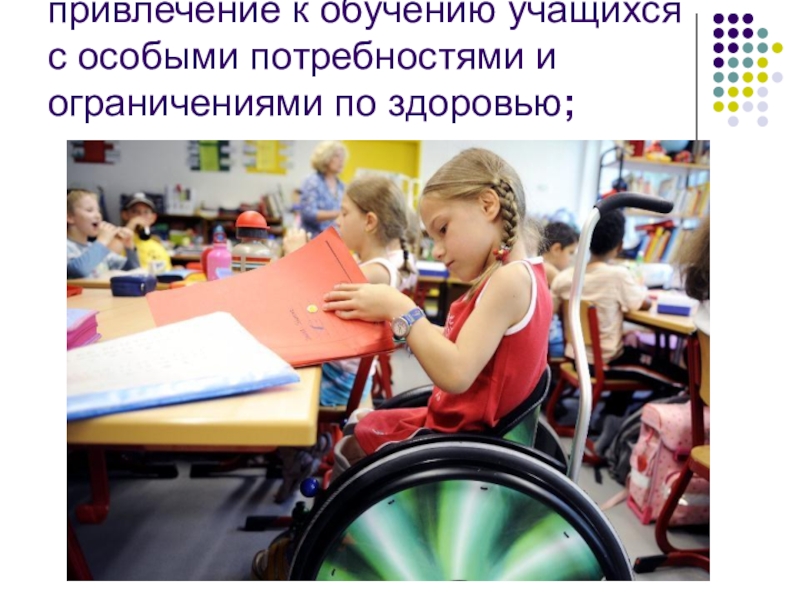 Слайд 33привлечение к обучению учащихся с особыми потребностями и ограничениями по здоровью;