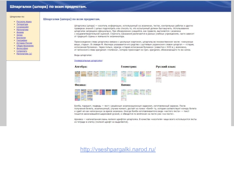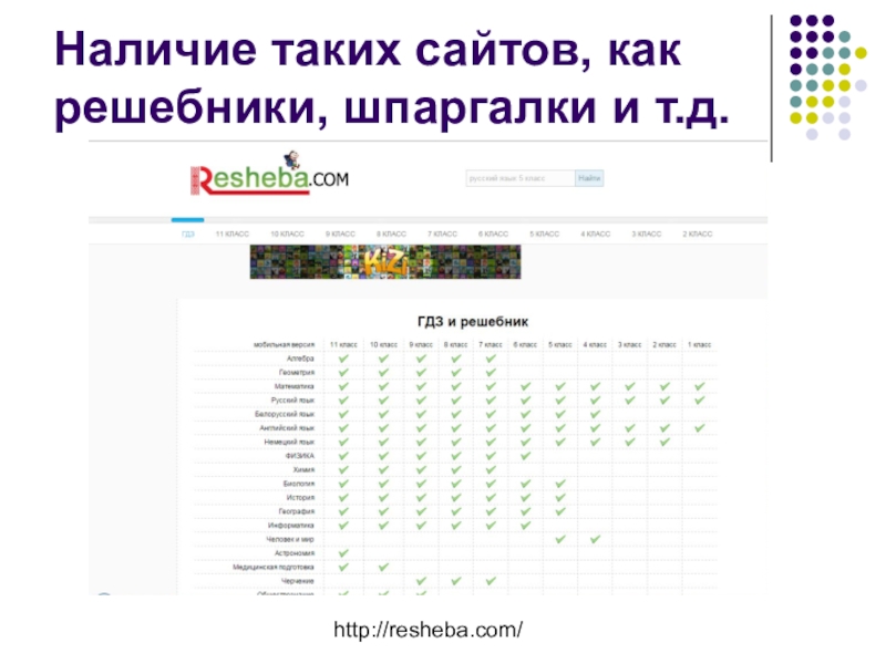 Слайд 13Наличие таких сайтов, как решебники, шпаргалки и т.д.