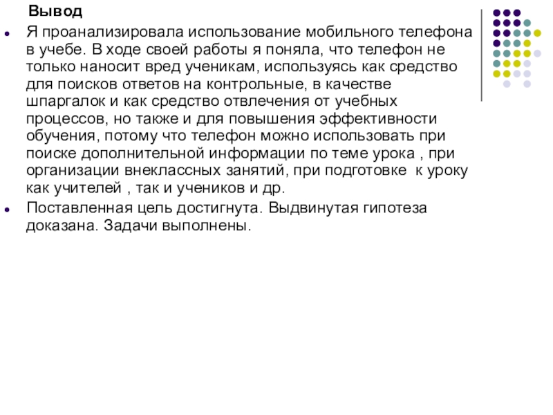 ходе своей работы я поняла, что телефон не только наносит вред ученикам, используясь как средство для поисков ответов на контрольные, в качестве шпаргалок и как средство отвлечения от учебных процессов, но также и для повышения эффективности обучения, потому что телефон можно использовать при поиске дополнительной информации по теме урока , при организации внеклассных занятий, при подготовке к уроку как учителей , так и учеников и др.