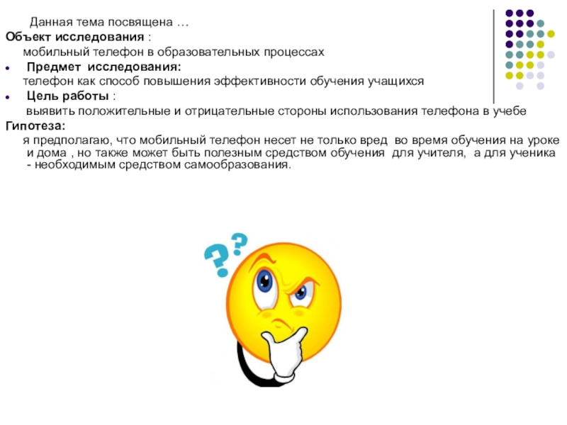 я предполагаю, что мобильный телефон несет не только вред во время обучения на уроке и дома , но также может быть полезным средством обучения для учителя, а для ученика - необходимым средством самообразования.