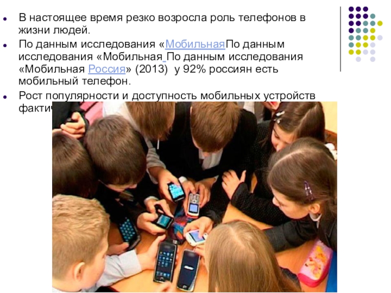 данным исследования «МобильнаяПо данным исследования «Мобильная По данным исследования «Мобильная Россия» (2013) у 92% россиян есть мобильный телефон.