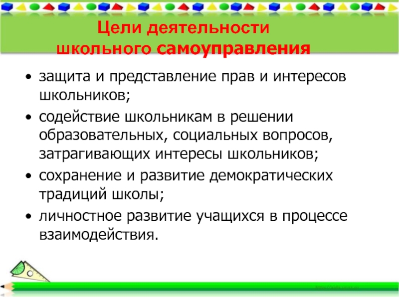 Слайд 6Школьное самоуправление – это процесс конструктивного взаимодействия школьников и администрации школы;