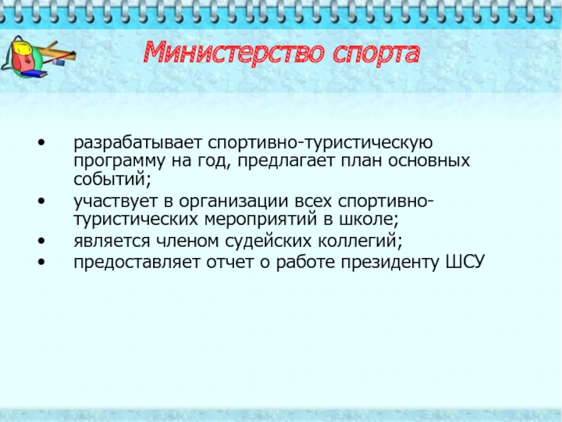 разрабатывает спортивно-туристическую программу на год, предлагает план основных событий;
