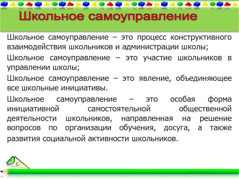 Школьное самоуправление – это особая форма инициативной самостоятельной общественной деятельности школьников, направленная на решение вопросов по организации обучения, досуга, а также развития социальной активности школьников.