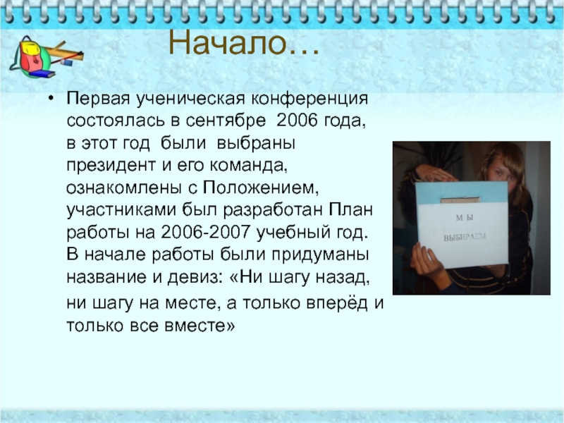 в этот год были выбраны президент и его команда, ознакомлены с Положением, участниками был разработан План работы на 2006-2007 учебный год. В начале работы были придуманы название и девиз: «Ни шагу назад,