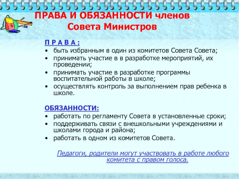 Слайд 13ПРАВА И ОБЯЗАННОСТИ членов Совета Министров