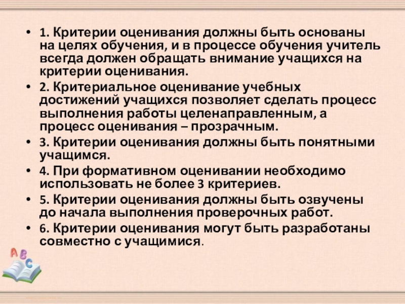 Слайд 821. Критерии оценивания должны быть основаны на целях обучения, и в