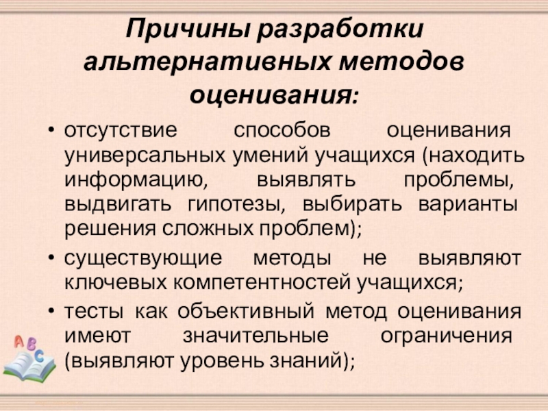 тесты как объективный метод оценивания имеют значительные ограничения (выявляют уровень знаний);